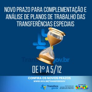 Notícia ATENÇÃO, GESTORA E GESTOR PÚBLICO: NOVOS PRAZOS PARA EMENDAS ESPECIAIS! A Secretaria de Relações Institucionais da Presidência da República (SRI/PR), o Ministério da Gestão e da Inovação em Serviços Públicos
